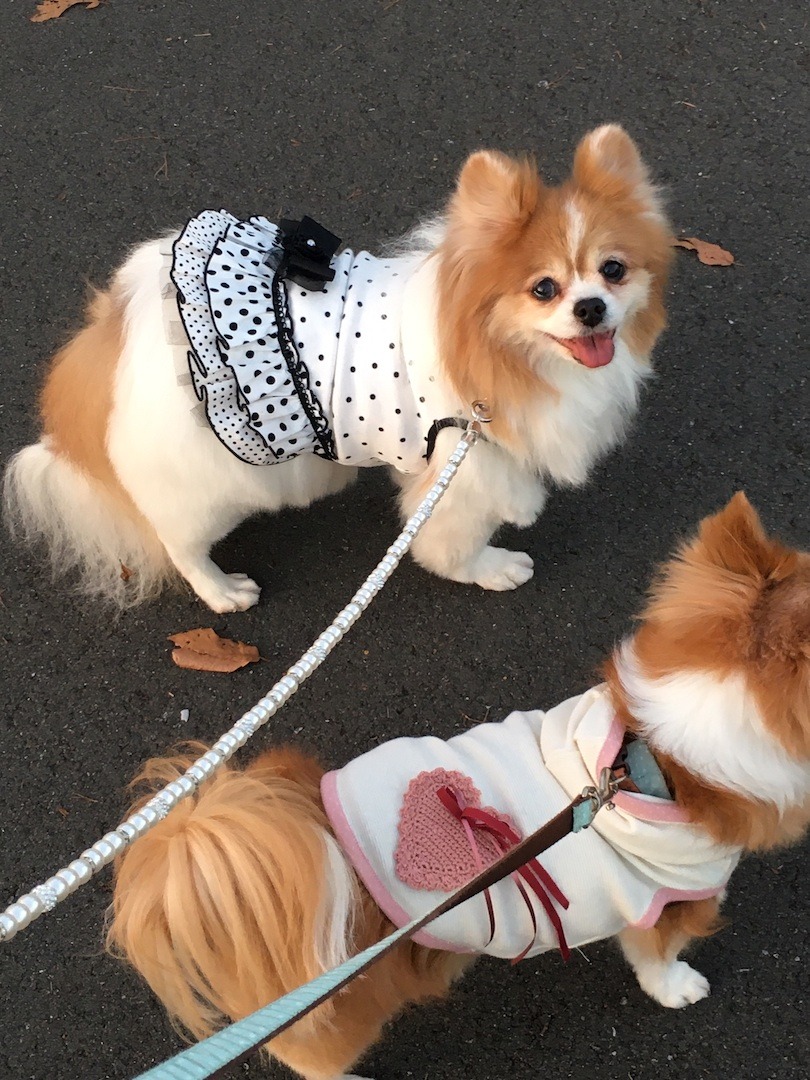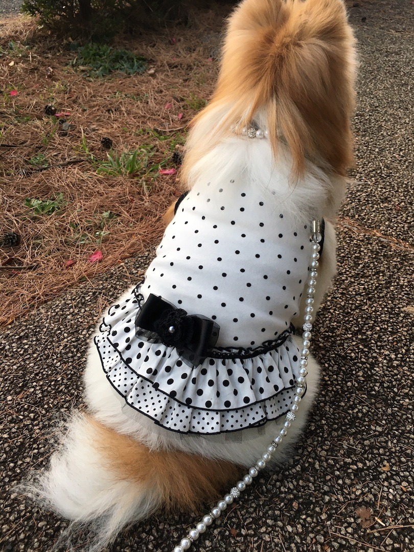 クロお花モチーフ付リボンを飾ったドットフリルタンクトップ(クロふち)のMサイズを着用したのは、ポメ×パピヨンのMix犬のユキちゃんです。ユキちゃんのボディサイズは、首からシッポまでが40cm、おしり周りが63cm。チョット大きく育っちゃいました…。